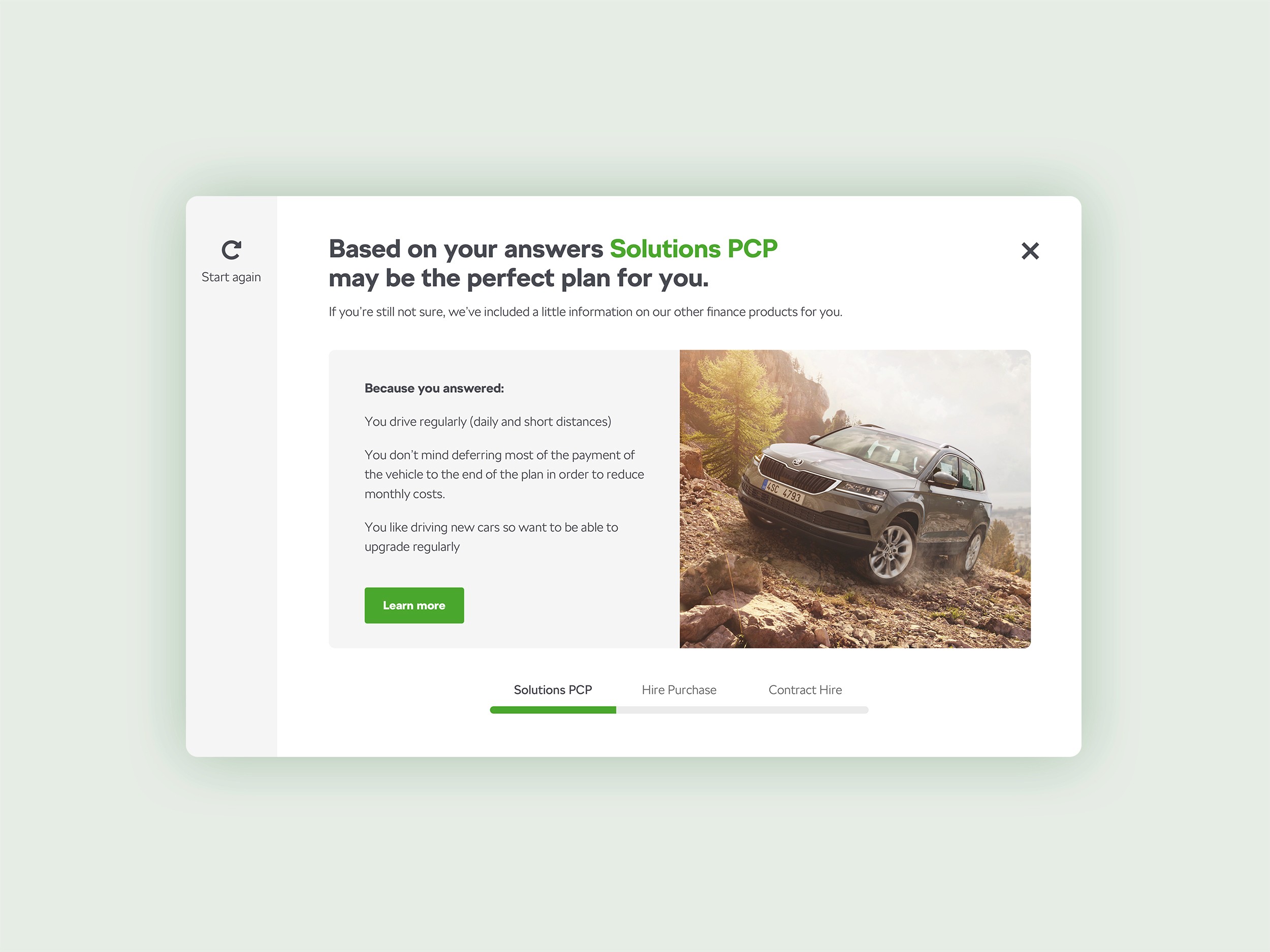 Decision tree tool to reduce frustration and improve conversions by guiding users through finance options.